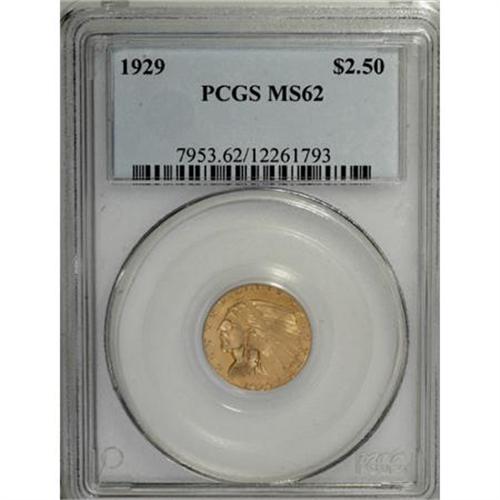 <B>1929 $2 1/2 MS62 PCGS.</B></I> . PCGS Population (3266/4174). NGC Census: (5356/6031). Mintage: 532,000. Numismedia Wsl. Price for NGC/PCGS coin in MS62: $435. (#7953)<BR><BR><B>Coin Engraver:</B> Bela Lyon Pratt<BR><BR><b>Shipping:</b> Coins & Currency (<a target="_blank" href="http://www.heritageauctions.com/common/shipping.php">view shipping information</a>)