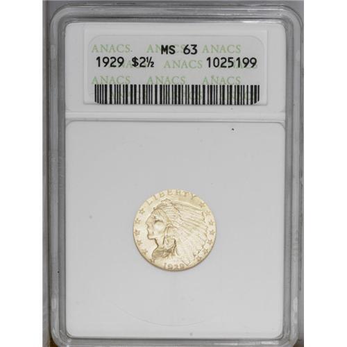 <B>1929<$2 1/2> MS63 ANACS.</B></I> A radiant and attractive example without mentionable marks. The strike is bold despite a small area of softness on the lower half of the headdress. <BR><BR><B>Important notice:</B> Heritage usually auctions material at the rate of 200-250 lots per hour. On some occasions eBay Live bid software or the Internet may not be able to keep up with the pace of the auction. We recommend placing a realistic absentee bid now as insurance to avoid disappointment. Occasionally the auctioneer may eliminate or reject an eBay Live bid, and the auctioneer may also reopen a lot after the close of the eBay live bidding (usually because we missed an audience bid), and may reject your bid even if it shows you as the winning bidder. By bidding via eBay Live, you agree that Heritage may award the lot to another bidder at its sole discretion under the circumstances described above or any other reasonable circumstances. Since eBay bids are not shown to us until we open the lot on the floor, we treat those bids just like floor bids. In most cases the floor responds before the eBay bid is presented to us, due to Internet lag time, so for consistency we have made it a policy that floor bids are always considered first over tie eBay live bids. Also please note that all Heritage lots purchased through eBay Live carry a 20% Buyer's Premium. Please make sure you read the Terms and Conditions before you bid. This lot is being auctioned in conjunction with a live floor auction by Heritage Galleries & Auctioneers. All final auction and invoice information will be supplied by Heritage Galleries & Auctioneers, and all other information should be considered preliminary. Lot:2539 <BR><BR><B>Winning Notification and Billing:</B> After the FINAL session in this auction is complete, Heritage will send e-mail and snail mail invoices. This process normally takes several days. All final auction and invoice information will be supplied by Heritage Galleries & Auctioneers, and all other information should be considered preliminary. <BR><BR>This auction will be conducted on a live auction floor and over the Internet through eBay Live. If you choose to place an absentee bid, please take a moment to <font color='#0000ff'><u><a href='http://pages.ebay.com/liveauctions/help/before/laabsentee.html'>learn how eBay Live absentee bidding works</a></u></font><font color='#000000'>