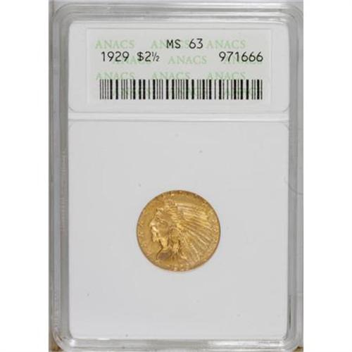 <B>1929 $2 1/2 MS63 ANACS.</B></I> NGC Census: (4050/1762). PCGS Population (2723/1276). Mintage: 532,000. Numismedia Wsl. Price for NGC/PCGS coin in MS63: $825. (#7953)<BR><BR><B>Coin Engraver:</B> Bela Lyon Pratt<BR><BR><b>Shipping:</b> Coins & Currency (<a target="_blank" href="http://www.heritageauctions.com/common/shipping.php">view shipping information</a>)