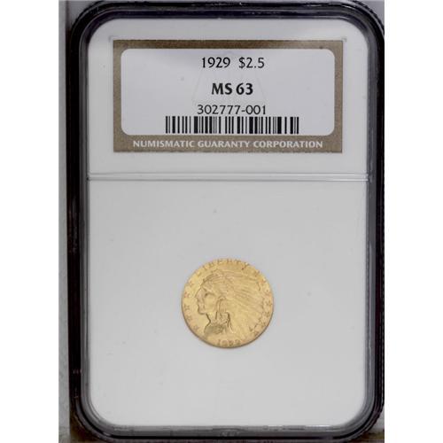 <B>1929<$2 1/2> MS63 NGC.</B></I> Sharply struck on the design elements, with peach-gold surfaces. A few minor handling marks are noted on each side. <BR><BR><B>Important notice:</B> Heritage usually auctions material at the rate of 200-250 lots per hour. On some occasions eBay Live bid software or the Internet may not be able to keep up with the pace of the auction. We recommend placing a realistic absentee bid now as insurance to avoid disappointment. Occasionally the auctioneer may eliminate or reject an eBay Live bid, and the auctioneer may also reopen a lot after the close of the eBay live bidding (usually because we missed an audience bid), and may reject your bid even if it shows you as the winning bidder. By bidding via eBay Live, you agree that Heritage may award the lot to another bidder at its sole discretion under the circumstances described above or any other reasonable circumstances. Since eBay bids are not shown to us until we open the lot on the floor, we treat those bids just like floor bids. In most cases the floor responds before the eBay bid is presented to us, due to Internet lag time, so for consistency we have made it a policy that floor bids are always considered first over tie eBay live bids. Also please note that all Heritage lots purchased through eBay Live carry a 20% Buyer's Premium. Please make sure you read the Terms and Conditions before you bid. This lot is being auctioned in conjunction with a live floor auction by Heritage Galleries & Auctioneers. All final auction and invoice information will be supplied by Heritage Galleries & Auctioneers, and all other information should be considered preliminary. Lot:2538 <BR><BR><B>Winning Notification and Billing:</B> After the FINAL session in this auction is complete, Heritage will send e-mail and snail mail invoices. This process normally takes several days. All final auction and invoice information will be supplied by Heritage Galleries & Auctioneers, and all other information should be considered preliminary. <BR><BR>This auction will be conducted on a live auction floor and over the Internet through eBay Live. If you choose to place an absentee bid, please take a moment to <font color='#0000ff'><u><a href='http://pages.ebay.com/liveauctions/help/before/laabsentee.html'>learn how eBay Live absentee bidding works</a></u></font><font color='#000000'>
