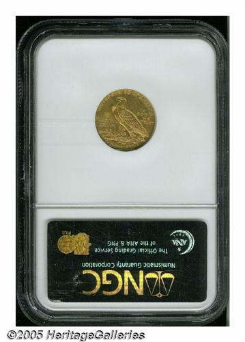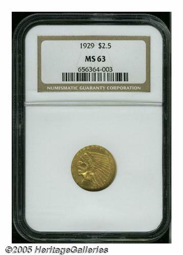 <B>1929<$2 1/2> MS63 NGC.</B></I> Well detailed and free of distractions, this satiny example displays lovely pastel pink and peach-gold toning, and seems expertly preserved. The luster is somewhat weak, however, and there are a few tiny blemishes on the reverse that can be seen with magnification.