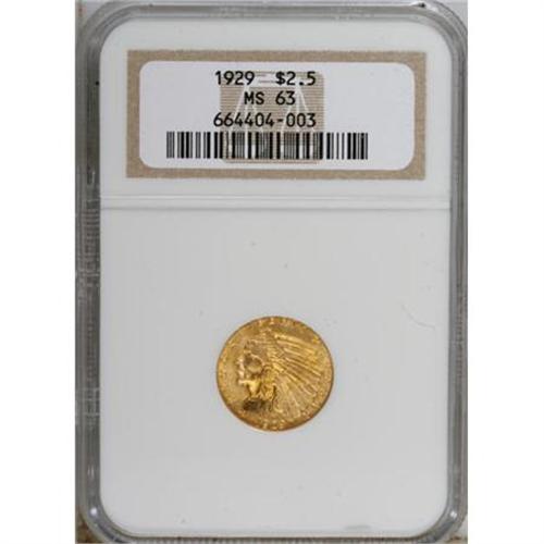 <B>1929 $2 1/2 MS63 NGC.</B></I> NGC Census: (4021/1742). PCGS Population (2710/1233). Mintage: 532,000. Numismedia Wsl. Price for NGC/PCGS coin in MS63: $760. (#7953)<BR><BR><B>Coin Engraver:</B> Bela Lyon Pratt<BR><BR><b>Shipping:</b> Coins & Currency (<a target="_blank" href="http://www.heritageauctions.com/common/shipping.php">view shipping information</a>)