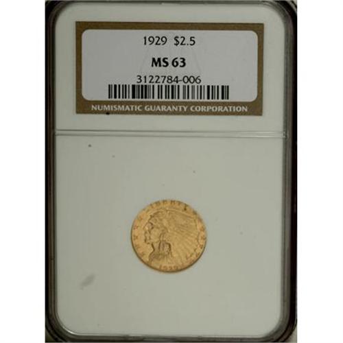 <B>1929 $2 1/2 MS63 NGC.</B></I> NGC Census: (4210/1878). PCGS Population (2848/1404). Mintage: 532,000. Numismedia Wsl. Price for NGC/PCGS coin in MS63: $945. (#7953)<BR><BR><B>Coin Engraver:</B> Bela Lyon Pratt<BR><BR><b>Shipping:</b> Coins & Currency (<a target="_blank" href="http://www.heritageauctions.com/common/shipping.php">view shipping information</a>)