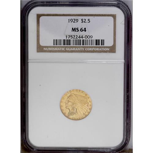 <B>1929<$2 1/2> MS64 NGC.</B></I> An exquisite example of this Indian quarter eagle. The luster is thick and frosty, and the devices are finely detailed. A premium quality example for the grade, as even under magnification, few troublesome contact marks are seen. <BR><BR><B>Important notice:</B> Heritage usually auctions material at the rate of 200-250 lots per hour. On some occasions eBay Live bid software or the Internet may not be able to keep up with the pace of the auction. We recommend placing a realistic absentee bid now as insurance to avoid disappointment. Occasionally the auctioneer may eliminate or reject an eBay Live bid, and the auctioneer may also reopen a lot after the close of the eBay live bidding (usually because we missed an audience bid), and may reject your bid even if it shows you as the winning bidder. By bidding via eBay Live, you agree that Heritage may award the lot to another bidder at its sole discretion under the circumstances described above or any other reasonable circumstances. Since eBay bids are not shown to us until we open the lot on the floor, we treat those bids just like floor bids. In most cases the floor responds before the eBay bid is presented to us, due to Internet lag time, so for consistency we have made it a policy that floor bids are always considered first over tie eBay live bids. Also please note that all Heritage lots purchased through eBay Live carry a 20% Buyer's Premium. Please make sure you read the Terms and Conditions before you bid. This lot is being auctioned in conjunction with a live floor auction by Heritage Galleries & Auctioneers. All final auction and invoice information will be supplied by Heritage Galleries & Auctioneers, and all other information should be considered preliminary. Lot:2543 <BR><BR><B>Winning Notification and Billing:</B> After the FINAL session in this auction is complete, Heritage will send e-mail and snail mail invoices. This process normally takes several days. All final auction and invoice information will be supplied by Heritage Galleries & Auctioneers, and all other information should be considered preliminary. <BR><BR>This auction will be conducted on a live auction floor and over the Internet through eBay Live. If you choose to place an absentee bid, please take a moment to <font color='#0000ff'><u><a href='http://pages.ebay.com/liveauctions/help/before/laabsentee.html'>learn how eBay Live absentee bidding works</a></u></font><font color='#000000'>
