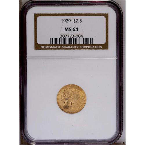 <B>1929<$2 1/2> MS64 NGC.</B></I> Deep lime-green and reddish coloration covers each side of this attractive example. The luster is satiny and full, and the design features are well struck. Small abrasions and faint pinscratches, in the fields, prevent a higher grade. <BR><BR><B>Important notice:</B> Heritage usually auctions material at the rate of 200-250 lots per hour. On some occasions eBay Live bid software or the Internet may not be able to keep up with the pace of the auction. We recommend placing a realistic absentee bid now as insurance to avoid disappointment. Occasionally the auctioneer may eliminate or reject an eBay Live bid, and the auctioneer may also reopen a lot after the close of the eBay live bidding (usually because we missed an audience bid), and may reject your bid even if it shows you as the winning bidder. By bidding via eBay Live, you agree that Heritage may award the lot to another bidder at its sole discretion under the circumstances described above or any other reasonable circumstances. Since eBay bids are not shown to us until we open the lot on the floor, we treat those bids just like floor bids. In most cases the floor responds before the eBay bid is presented to us, due to Internet lag time, so for consistency we have made it a policy that floor bids are always considered first over tie eBay live bids. Also please note that all Heritage lots purchased through eBay Live carry a 20% Buyer's Premium. Please make sure you read the Terms and Conditions before you bid. This lot is being auctioned in conjunction with a live floor auction by Heritage Galleries & Auctioneers. All final auction and invoice information will be supplied by Heritage Galleries & Auctioneers, and all other information should be considered preliminary. Lot:2541 <BR><BR><B>Winning Notification and Billing:</B> After the FINAL session in this auction is complete, Heritage will send e-mail and snail mail invoices. This process normally takes several days. All final auction and invoice information will be supplied by Heritage Galleries & Auctioneers, and all other information should be considered preliminary. <BR><BR>This auction will be conducted on a live auction floor and over the Internet through eBay Live. If you choose to place an absentee bid, please take a moment to <font color='#0000ff'><u><a href='http://pages.ebay.com/liveauctions/help/before/laabsentee.html'>learn how eBay Live absentee bidding works</a></u></font><font color='#000000'>