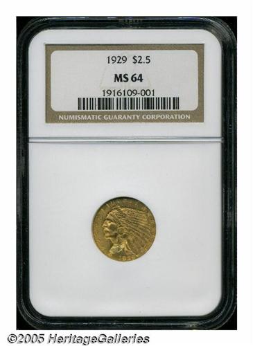 <B>1929<$2 1/2> MS64 NGC.</B></I> Highly lustrous with frosty yellow-gold surfaces, accompanied by only the slightest wisps of rose toning on the obverse.