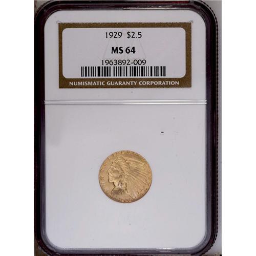 "1929 $2 1/2 MS64 NGC. Sharply struck, w"