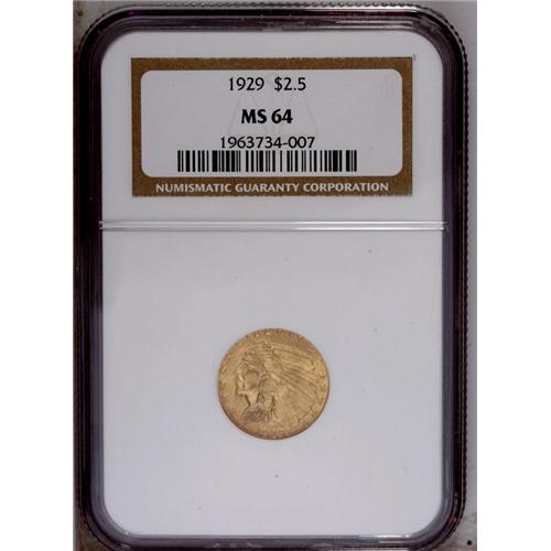 <B>1929<$2 1/2> MS64 NGC.</B></I> The 1929 is the final Indian quarter eagle, and is readily available through Choice grades. The overall strike is relatively good, and the straw-gold surfaces display soft luster. As with most coins of this issue, there are some superficial marks.