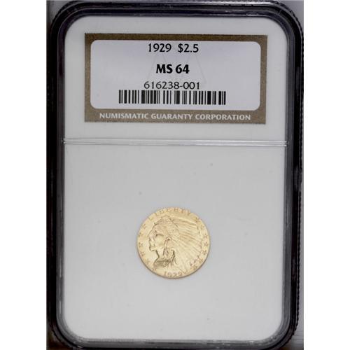<B>1929<$2 1/2> MS64 NGC.</B></I> The final year of issue of Bela Lyon Pratt's revolutionary incuse design coinage. This attractive specimen displays gleaming luster and frosted surfaces.