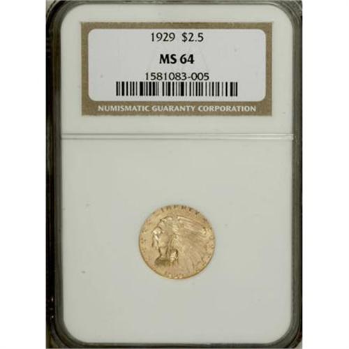 <B>1929 $2 1/2 MS64 NGC.</B></I> NGC Census: (1653/109). PCGS Population (1144/109). Mintage: 532,000. Numismedia Wsl. Price for NGC/PCGS coin in MS64: $1,475. (#7953)<BR><BR><B>Coin Engraver:</B> Bela Lyon Pratt<BR><BR><b>Shipping:</b> Coins & Currency (<a target="_blank" href="http://www.heritageauctions.com/common/shipping.php">view shipping information</a>)