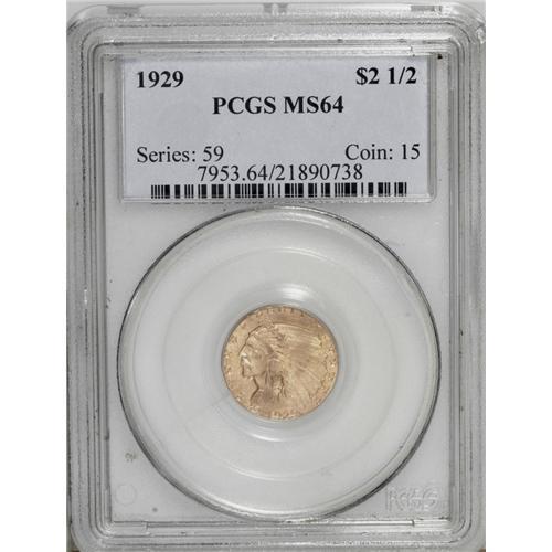 1929 $2 1/2 MS64 PCGS. A lustrous wheat-gold piece wit