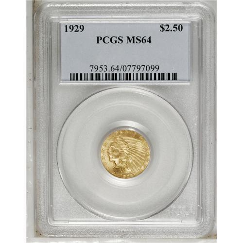 <B>1929<$2 1/2> MS64 PCGS.</B></I> A sharply defined example with brilliant light yellow color and frosty surfaces. Fully lustrous and attractive. This is the final year of the denomination, and the only common gold coin of the year.