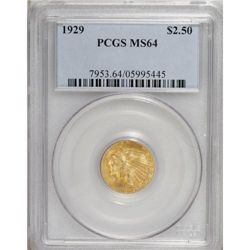 <B>1929 $2 1/2 MS64 PCGS.</B></I> A slightly better date in a lovely state of preservation. The strike is full on both the obverse and reverse. The color is outstanding from bright yellow on the obverse to a shimmering, multi-hued reverse. A perfect choice for a date set.<BR><BR><b>Shipping:</b> Coins & Currency (<a target="_blank" href="http://www.heritageauctions.com/common/shipping.php">view shipping information</a>)