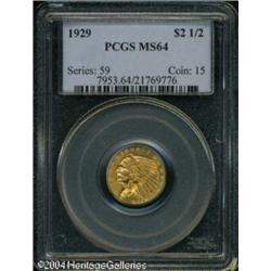 1929 $2 1/2 MS64 PCGS. Apricot-gold patina rests o <B>1929 $2 1/2 MS64 PCGS.</B></I> Apricot-gold patina rests over lustrous surfaces that exhibit well struck design elements. A few light contact marks are noted on the Indian's face and in the reverse fields. <BR><BR><B>Important notice:</B> Heritage usually auctions material at the rate of 200-250 lots per hour. On some occasions eBay Live bid software or the Internet may not be able to keep up with the pace of the auction. We recommend placing a realistic absentee bid now as insurance to avoid disappointment. Occasionally the auctioneer may eliminate or reject an eBay Live bid, and the auctioneer may also reopen a lot after the close of the eBay live bidding (usually because we missed an audience bid), and may reject your bid even if it shows you as the winning bidder. By bidding via eBay Live, you agree that Heritage may award the lot to another bidder at its sole discretion under the circumstances described above or any other reasonable circumstances. Since eBay bids are not shown to us until we open the lot on the floor, we treat those bids just like floor bids. In most cases the floor responds before the eBay bid is presented to us, due to Internet lag time, so for consistency we have made it a policy that floor bids are always considered first over tie eBay live bids. Also please note that all Heritage lots purchased through eBay Live carry a 20% Buyer's Premium. Please make sure you read the Terms and Conditions before you bid. This lot is being auctioned in conjunction with a live floor auction by Heritage Galleries & Auctioneers. All final auction and invoice information will be supplied by Heritage Galleries & Auctioneers, and all other information should be considered preliminary. Lot:6585