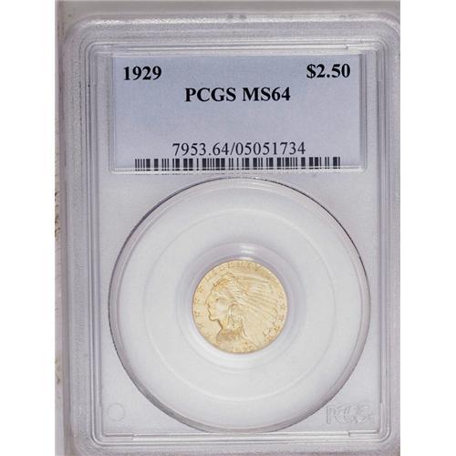 <B>1929<$2 1/2> MS64 PCGS.</B></I> Boldly struck with satin luster and a pleasing combination of apricot, mint-green, and red-orange patina. A few wispy marks are noted on each side of this relatively attractive near-Gem.