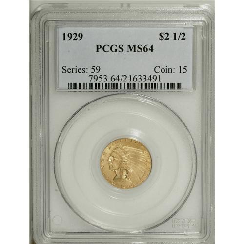 <B>1929 $2 1/2 MS64 PCGS.</B></I> The honey-gold surfaces are bright. The design features show strong detail, and a few small marks are seen in the upper reverse field. A couple of small alloy spots are noted near the Indian's ear, and another at the upper part of the eagle's right leg.<BR><BR><b>Shipping:</b> Coins & Currency (<a target="_blank" href="http://www.heritageauctions.com/common/shipping.php">view shipping information</a>)