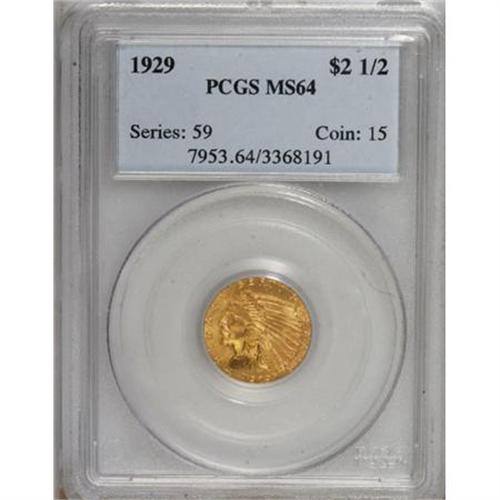 <B>1929 $2 1/2 MS64 PCGS.</B></I> Highly lustrous with minor marks in the obverse fields. This solidly struck wheat-gold near-Gem has delicate honey-colored highlights on each side. A pleasing example from the final year of the denomination.<BR><BR><B>Coin Engraver:</B> Bela Lyon Pratt<BR><BR><b>Shipping:</b> Coins & Currency (<a target="_blank" href="http://www.heritageauctions.com/common/shipping.php">view shipping information</a>)