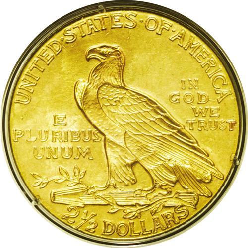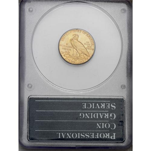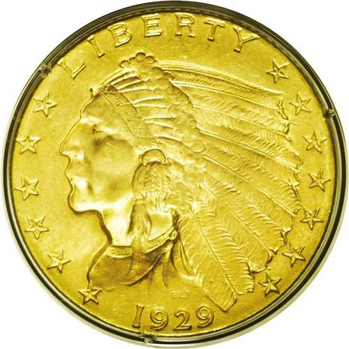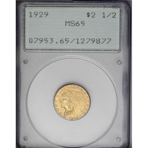 <B>1929<$2 1/2> MS65 PCGS.</B></I> A smooth and boldly struck Gem with original peach and gunmetal-gray toning. The 1929 quarter eagle has a lower production than its rare 1929 half eagle counterpart. Apparently, the quarter eagle was either hoarded or exported, while the half eagle lingered in mint vaults until Roosevelt's gold recall. Encapsulated in a first generation holder.