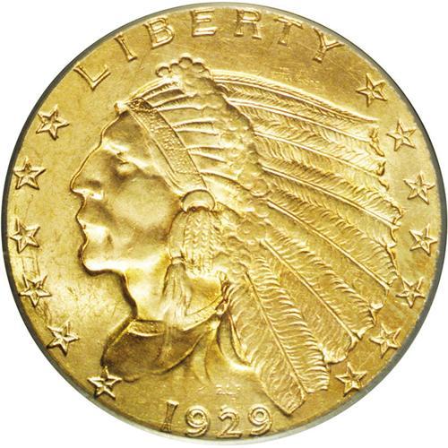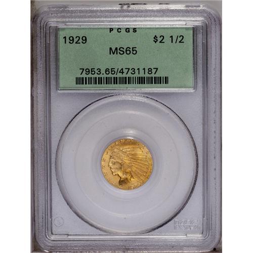 <B>1929<$2 1/2> MS65 PCGS.</B></I> Boldly defined with warm reddish-orange patina draped over minimally abraded surfaces. An eminently popular issue that is also an important coin for collectors of final-year type, the 1929 quarter eagle is also a difficult issue to locate as a Gem. Population: 92 in 65, 3 finer (3/06). <BR><BR><B>Important notice:</B> Heritage usually auctions material at the rate of 200-250 lots per hour. On some occasions eBay Live bid software or the Internet may not be able to keep up with the pace of the auction. We recommend placing a realistic absentee bid now as insurance to avoid disappointment. Occasionally the auctioneer may eliminate or reject an eBay Live bid, and the auctioneer may also reopen a lot after the close of the eBay live bidding (usually because we missed an audience bid), and may reject your bid even if it shows you as the winning bidder. By bidding via eBay Live, you agree that Heritage may award the lot to another bidder at its sole discretion under the circumstances described above or any other reasonable circumstances. Since eBay bids are not shown to us until we open the lot on the floor, we treat those bids just like floor bids. In most cases the floor responds before the eBay bid is presented to us, due to Internet lag time, so for consistency we have made it a policy that floor bids are always considered first over tie eBay live bids. Also please note that all Heritage lots purchased through eBay Live carry a 20% Buyer's Premium. Please make sure you read the Terms and Conditions before you bid. This lot is being auctioned in conjunction with a live floor auction by Heritage Galleries & Auctioneers. All final auction and invoice information will be supplied by Heritage Galleries & Auctioneers, and all other information should be considered preliminary. Lot:2545 <BR><BR><B>Winning Notification and Billing:</B> After the FINAL session in this auction is complete, Heritage will send e-mail and snail mail invoices. This process normally takes several days. All final auction and invoice information will be supplied by Heritage Galleries & Auctioneers, and all other information should be considered preliminary. <BR><BR>This auction will be conducted on a live auction floor and over the Internet through eBay Live. If you choose to place an absentee bid, please take a moment to <font color='#0000ff'><u><a href='http://pages.ebay.com/liveauctions/help/before/laabsentee.html'>learn how eBay Live absentee bidding works</a></u></font><font color='#000000'>