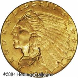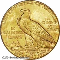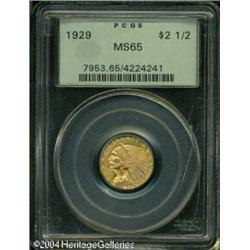 1929 $2 1/2 MS65 PCGS. Perhaps not technically per <B>1929 $2 1/2 MS65 PCGS.</B></I> Perhaps not technically perfect as a magnifier reveals a few tiny abrasions scattered about, and the striking details are a bit soft on the lowest feather of the headdress. However, this is an absolutely stunning coin. The mint luster is thick and heavily frosted and each side shows subtle golden-orange coloration. Population: 90 in 65, 3 finer (10/04). <BR><BR><B>Important notice:</B> Heritage usually auctions material at the rate of 200-250 lots per hour. On some occasions eBay Live bid software or the Internet may not be able to keep up with the pace of the auction. We recommend placing a realistic absentee bid now as insurance to avoid disappointment. Occasionally the auctioneer may eliminate or reject an eBay Live bid, and the auctioneer may also reopen a lot after the close of the eBay live bidding (usually because we missed an audience bid), and may reject your bid even if it shows you as the winning bidder. By bidding via eBay Live, you agree that Heritage may award the lot to another bidder at its sole discretion under the circumstances described above or any other reasonable circumstances. Since eBay bids are not shown to us until we open the lot on the floor, we treat those bids just like floor bids. In most cases the floor responds before the eBay bid is presented to us, due to Internet lag time, so for consistency we have made it a policy that floor bids are always considered first over tie eBay live bids. Also please note that all Heritage lots purchased through eBay Live carry a 20% Buyer's Premium. Please make sure you read the Terms and Conditions before you bid. This lot is being auctioned in conjunction with a live floor auction by Heritage Galleries & Auctioneers. All final auction and invoice information will be supplied by Heritage Galleries & Auctioneers, and all other information should be considered preliminary. Lot:6586