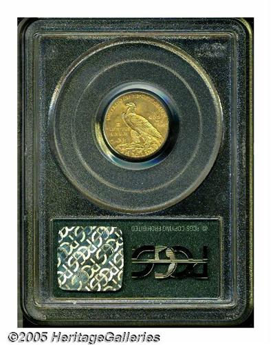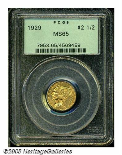<B>1929<$2 1/2> MS65 PCGS.</B></I> Unlike its Half Eagle counterpart, the 1929 Indian Quarter Eagle is a relatively available coin in all grades. However, this issue's certified population does drop off rapidly above the MS64 level, and the number of accurately graded Gems is unequal to that of high quality gold specialists. Thickly frosted in all areas, the surfaces are free of grade-limiting bagmarks. The central features are sharp, but the bottom feathers in the Indian's headdress are inadequately defined due to uneven striking pressure. Still, this is an exceptionally attractive survivor of this conditionally scarce, final-year issue.