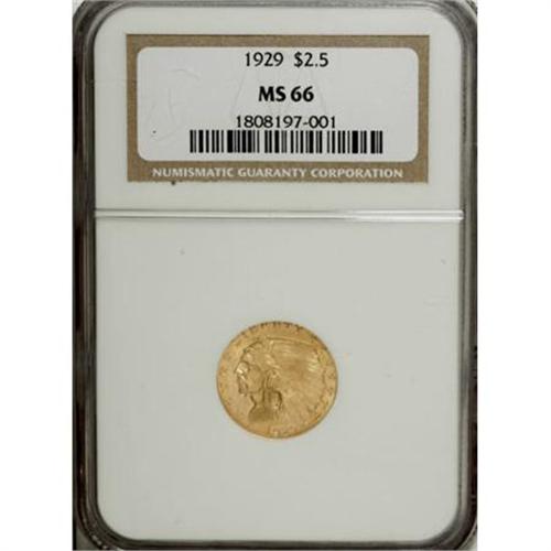 <B>1929 $2 1/2 MS66 NGC.</B></I> This strongly lustrous yellow-gold example offers excellent visual appeal and exquisitely preserved surfaces. The lemon-gold surfaces have a slightly frosty quality to them, and the few tiny marks present on the surfaces appear in inoffensive places. An attractive representative of the final quarter eagle struck for circulation.<BR> While the 1929 is readily available in circulated grades like the other 1920s issues, better Mint State pieces remain elusive, and this piece offers an uncommon opportunity for the discerning collector. The populations listed by Garrett and Guth (2006) remain accurate: "PCGS has graded a single coin as high as MS67, and both NGC and PCGS have graded a total of three others as MS66, making either grade virtually unobtainable." This simply stellar Premium Gem is the lone example from that list certified by NGC (7/07).<BR><BR><B>Coin Engraver:</B> Bela Lyon Pratt<BR><BR><b>Shipping:</b> Coins & Currency (<a target="_blank" href="http://www.heritageauctions.com/common/shipping.php">view shipping information</a>\)
