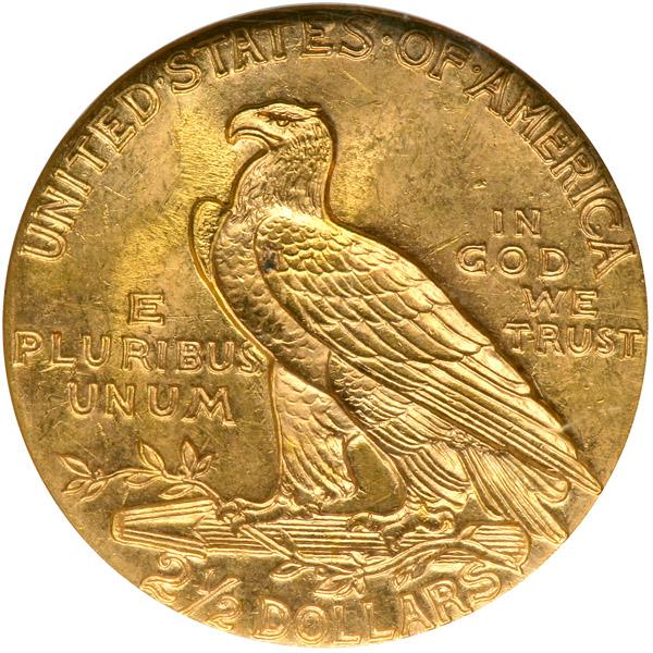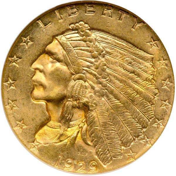 1929 $2.50 Indian. NGC graded MS-65. Mostly frosty and untoned. The surfaces are sleek and glowing with a healthy show of gold color. Everywhere there is brilliance. What one sees usually on this year's coinage is a slightly unconvincing impression left by the recoil of the dies; greatly to our pleasure and the bidders' enjoyment, on the other hand, that is scarcely the case here. This coin is sharp. Pop 185; 2 finer in 66 (PCGS # 7953) .