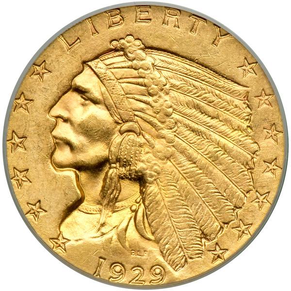 1929 $2.50 Indian. PCGS graded MS-63 CAC Approved. A nice full strike and a Premium Quality coin for the grade (PCGS # 7953) .