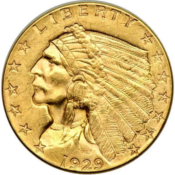 1929 $2.50 Indian. PCGS graded MS-63. Nice and frosty, this is the final year in which the mint struck Quarter Eagles. By the 1920s, small denomination gold coins weren't used much in day to day transactions since paper money (backed by gold or silver) satisfied the public with its ease of use (PCGS # 7953) .