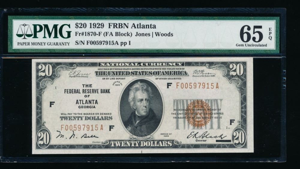 One 1929 $20 Atlanta Federal Reserve Bank Note PMG 65EPQ.