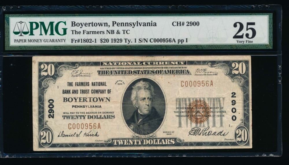 One 1929 $20 Boyertown National Bank Note PMG 25.