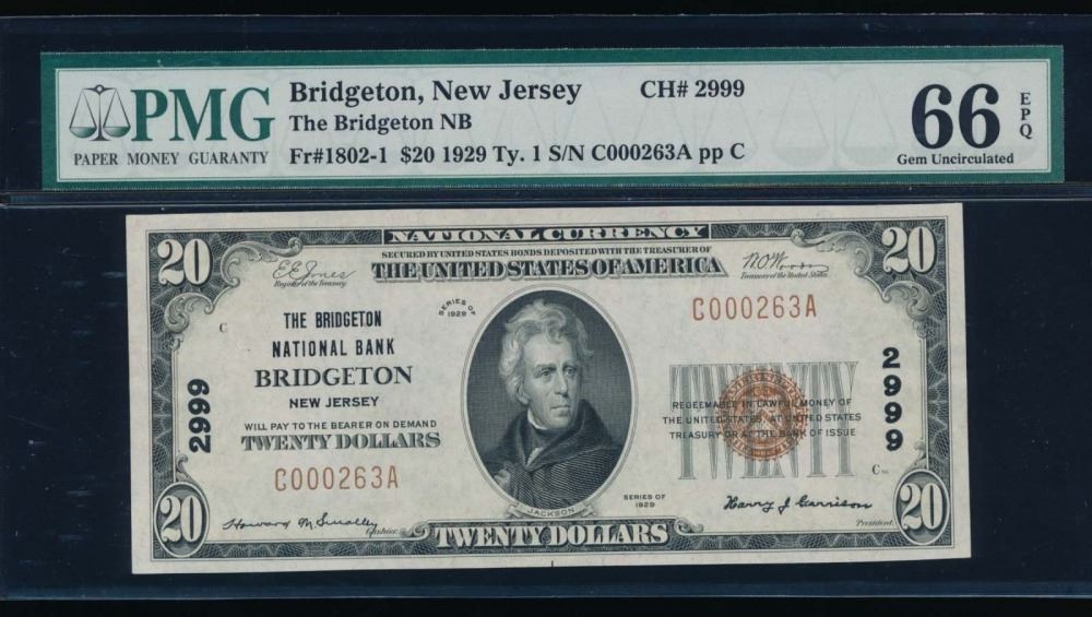 One 1929 $20 Bridgeton National Bank Note PMG 66EPQ.