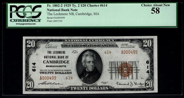 One 1929 $20 Cambridge National Bank Note PCGS 58.