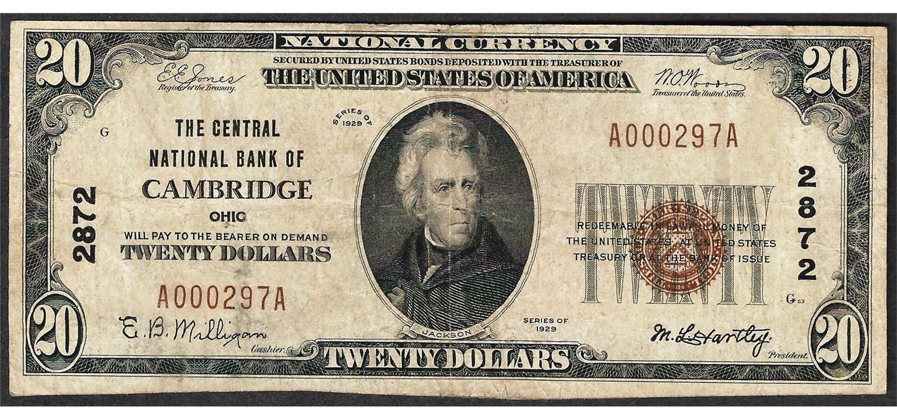 One 1929 $20 Central National Bank of Cambridge Currency Note CH# 2872.