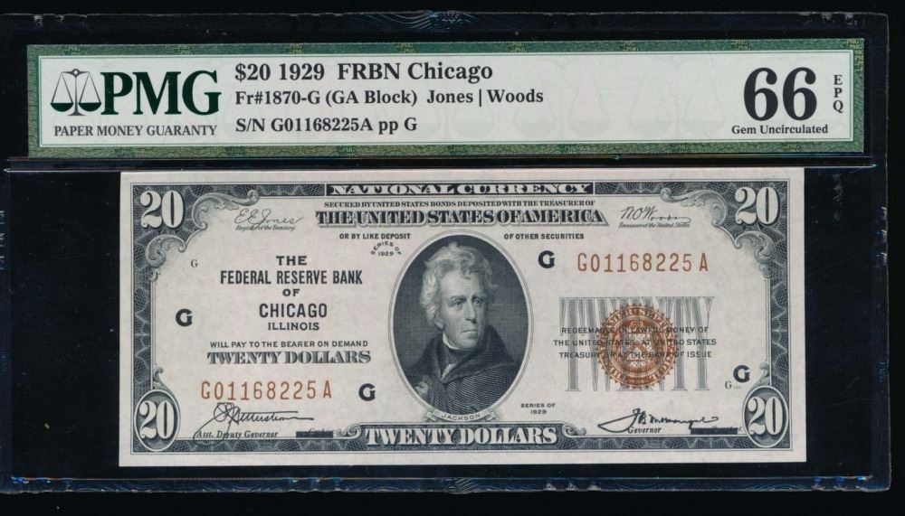 One 1929 $20 Chicago Federal Reserve Bank Note PMG 66EPQ.