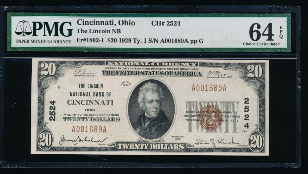 One 1929 $20 Cincinnati National Bank Note PMG 64EPQ.