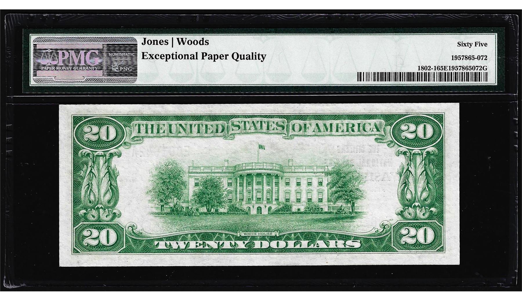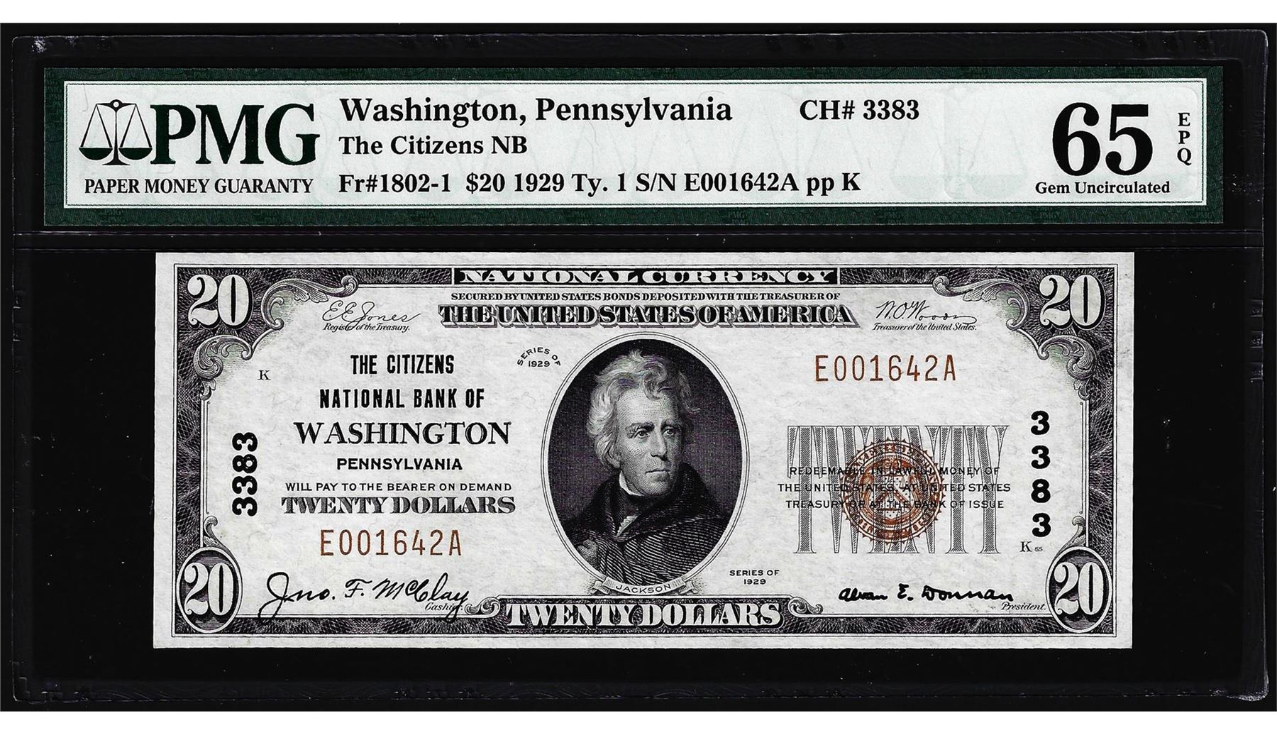 One 1929 $20 Citizens NB Washington, PA CH# 3383 National Note PMG Choice Gem Unc 65EPQ. PMG Certified.