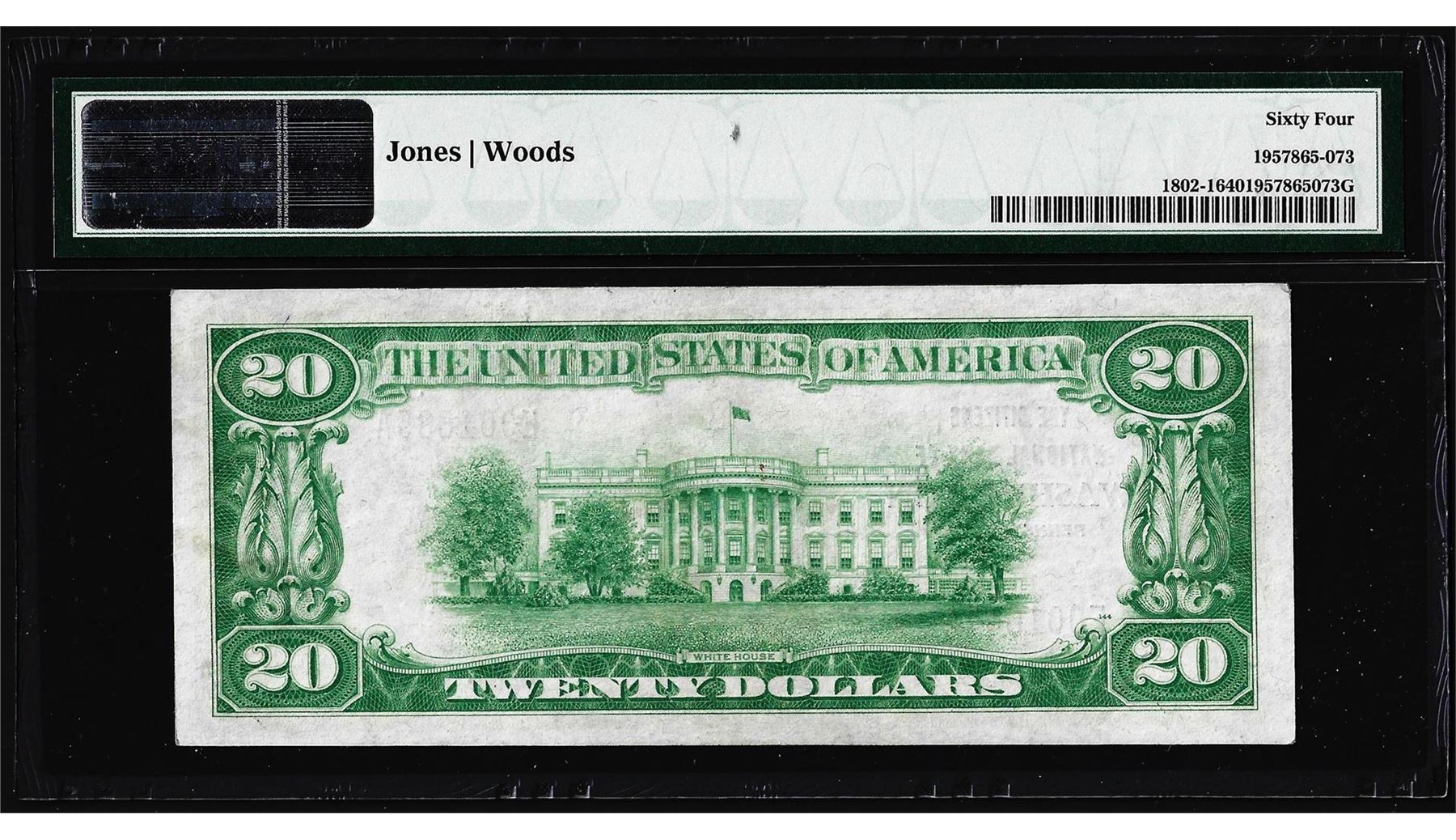 One 1929 $20 Citizens NB Washington, PA CH# 3383 National Note PMG Choice Uncirculated 64. PMG Certified.