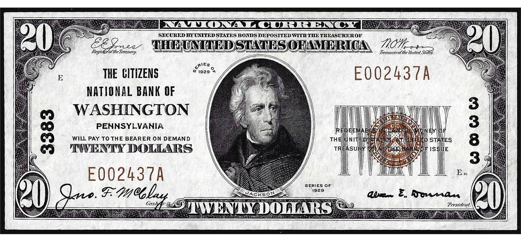 One 1929 $20 Citizens NB of Washington, Pennsylvania CH# 3383 National Currency Note.