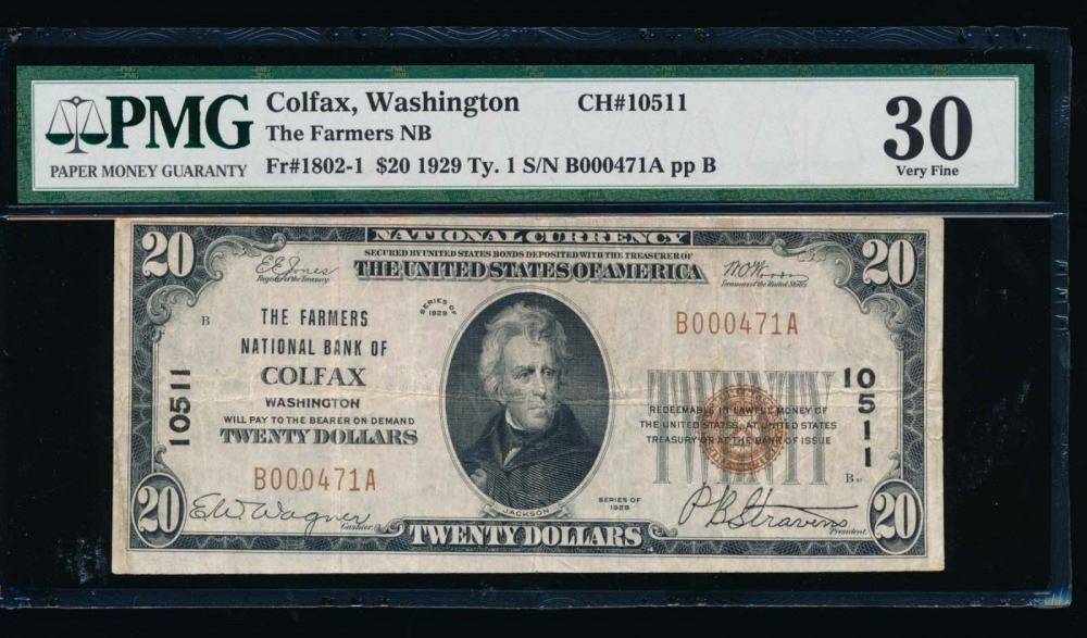 One 1929 $20 Colfax National Bank Note PMG 30.