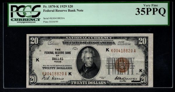 One 1929 $20 Dallas Federal Reserve Bank Note PCGS 35PPQ.