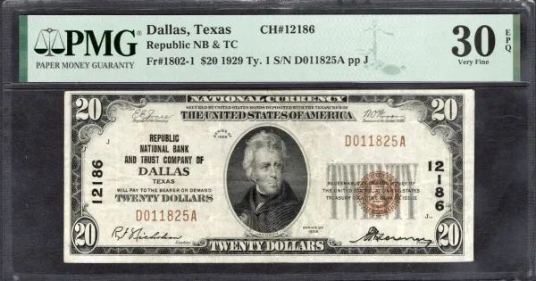 One 1929 $20 Dallas TX National PMG 30EPQ.
