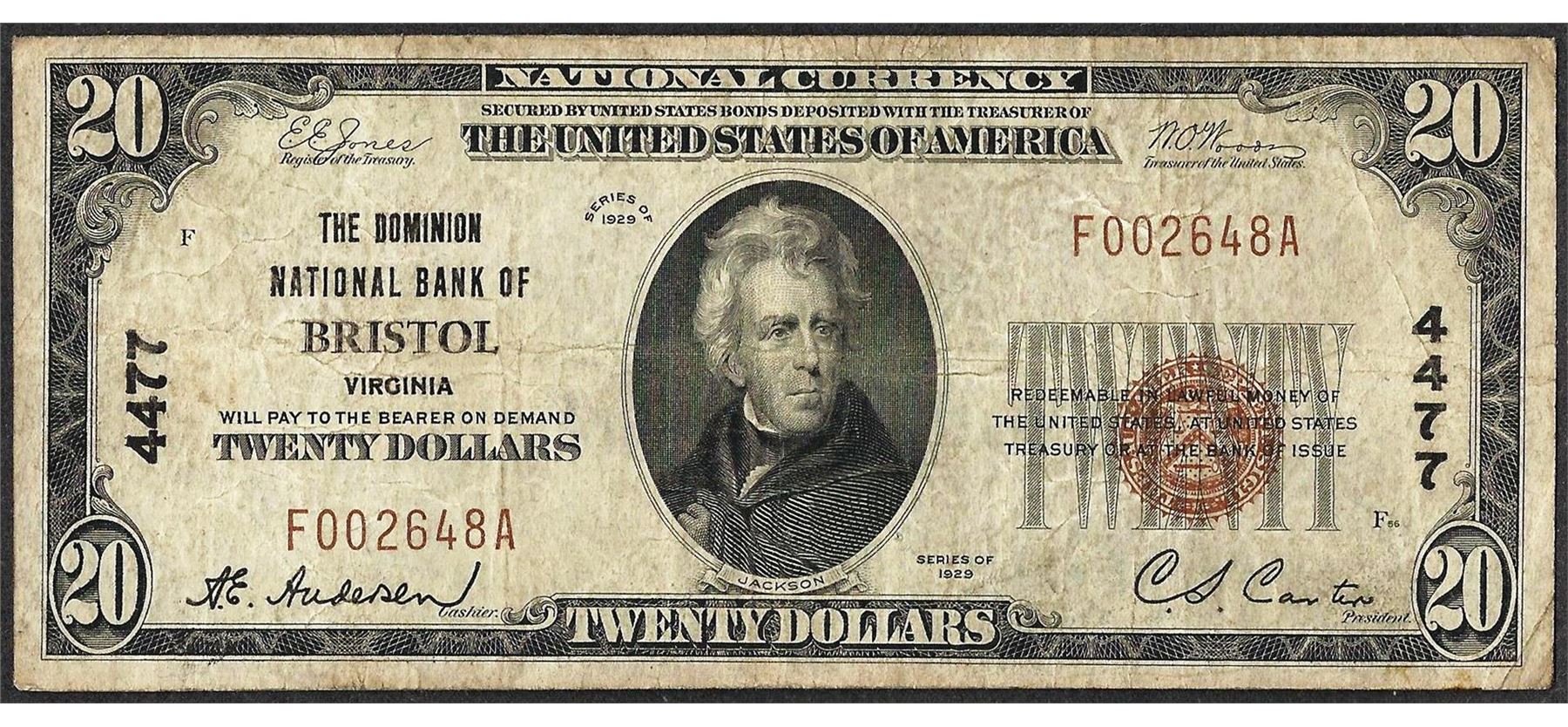 One 1929 $20 Dominion National Bank of Bristol, VA CH# 4477 National Currency Note.