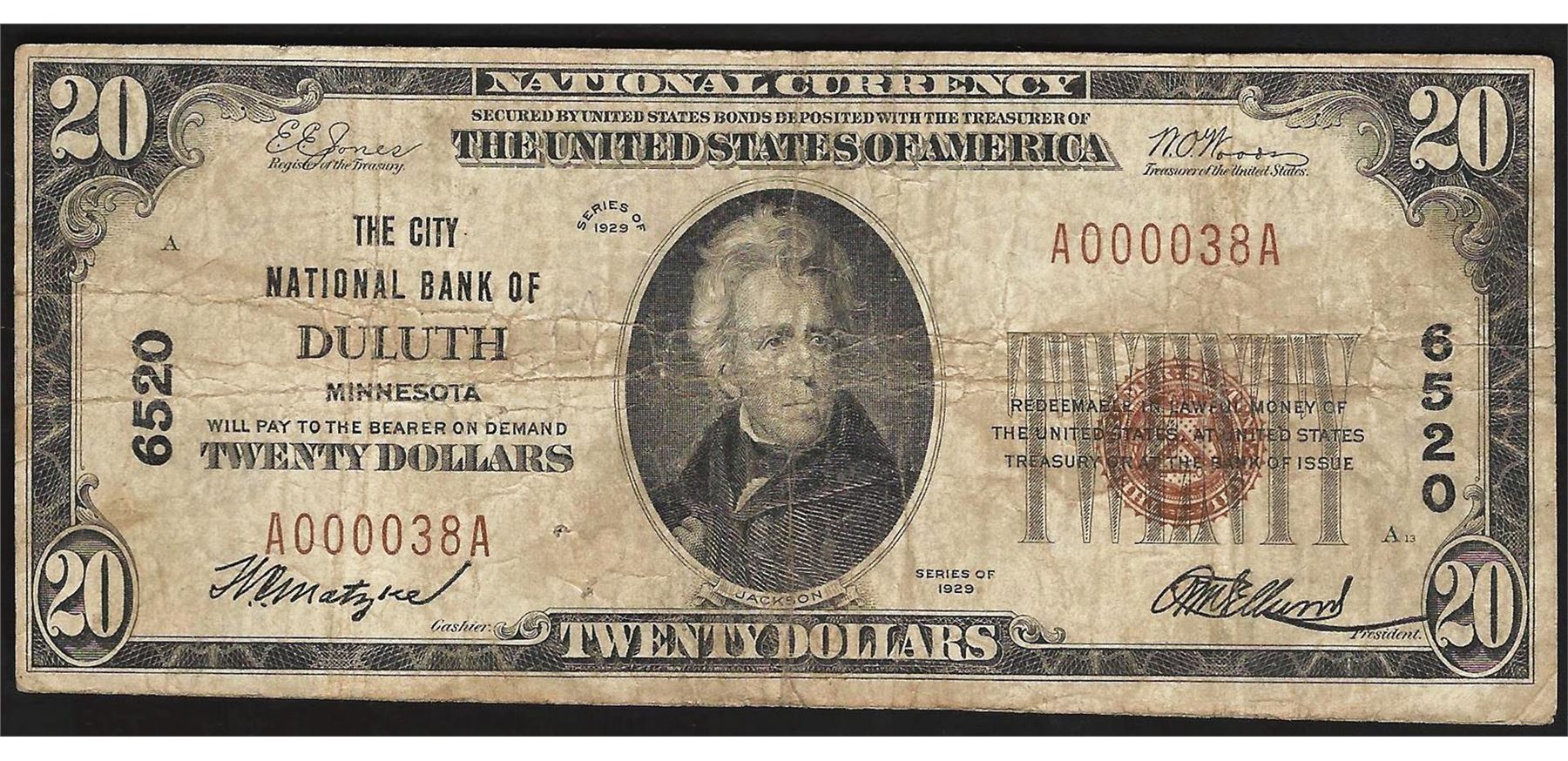 One 1929 $20 Duluth Minnesota National Bank CH# 6520.