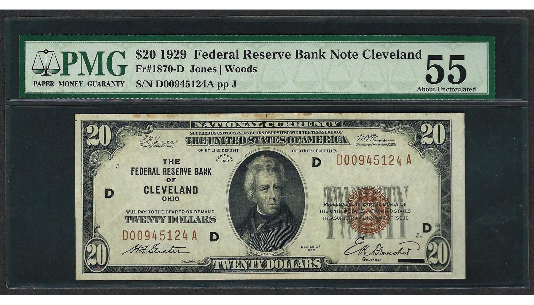 One 1929 $20 Federal Bank of Cleveland Fr.1870-D Note PMG About Uncirculated 55. PMG Certified.