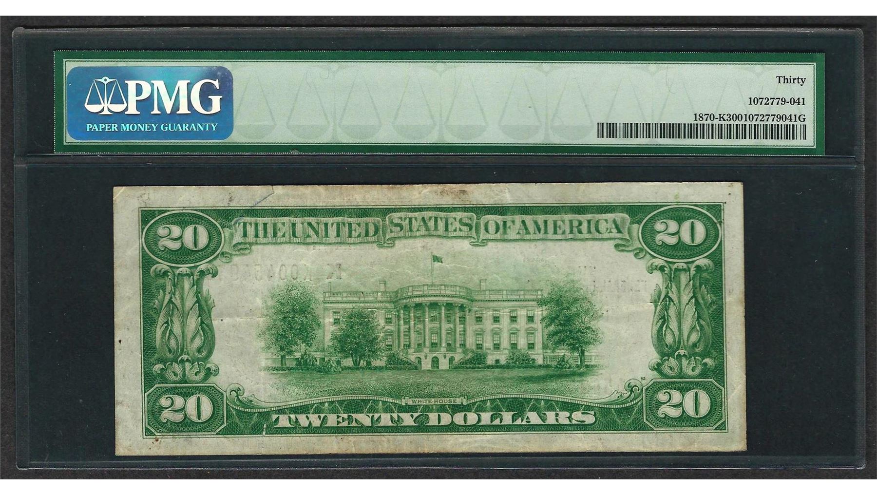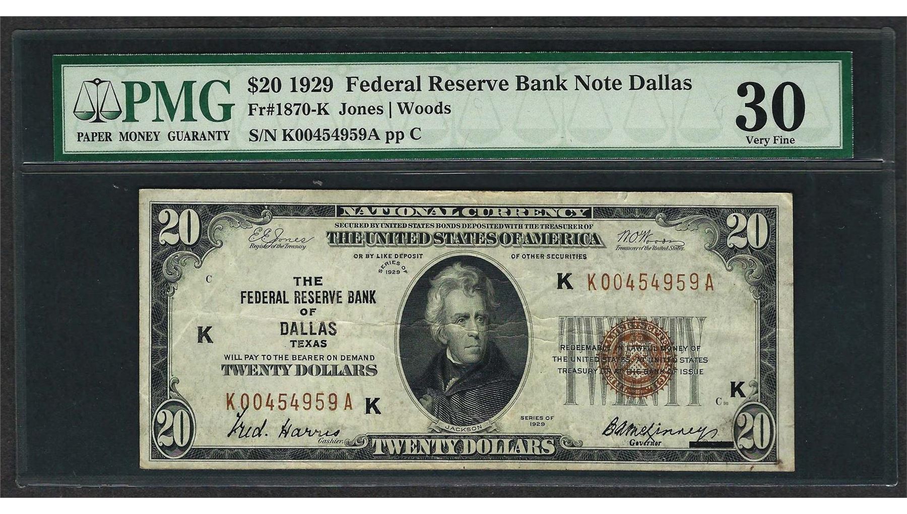 One 1929 $20 Federal Bank of Dallas Fr.1870-K Note PMG Very Fine 30. PMG Certified.