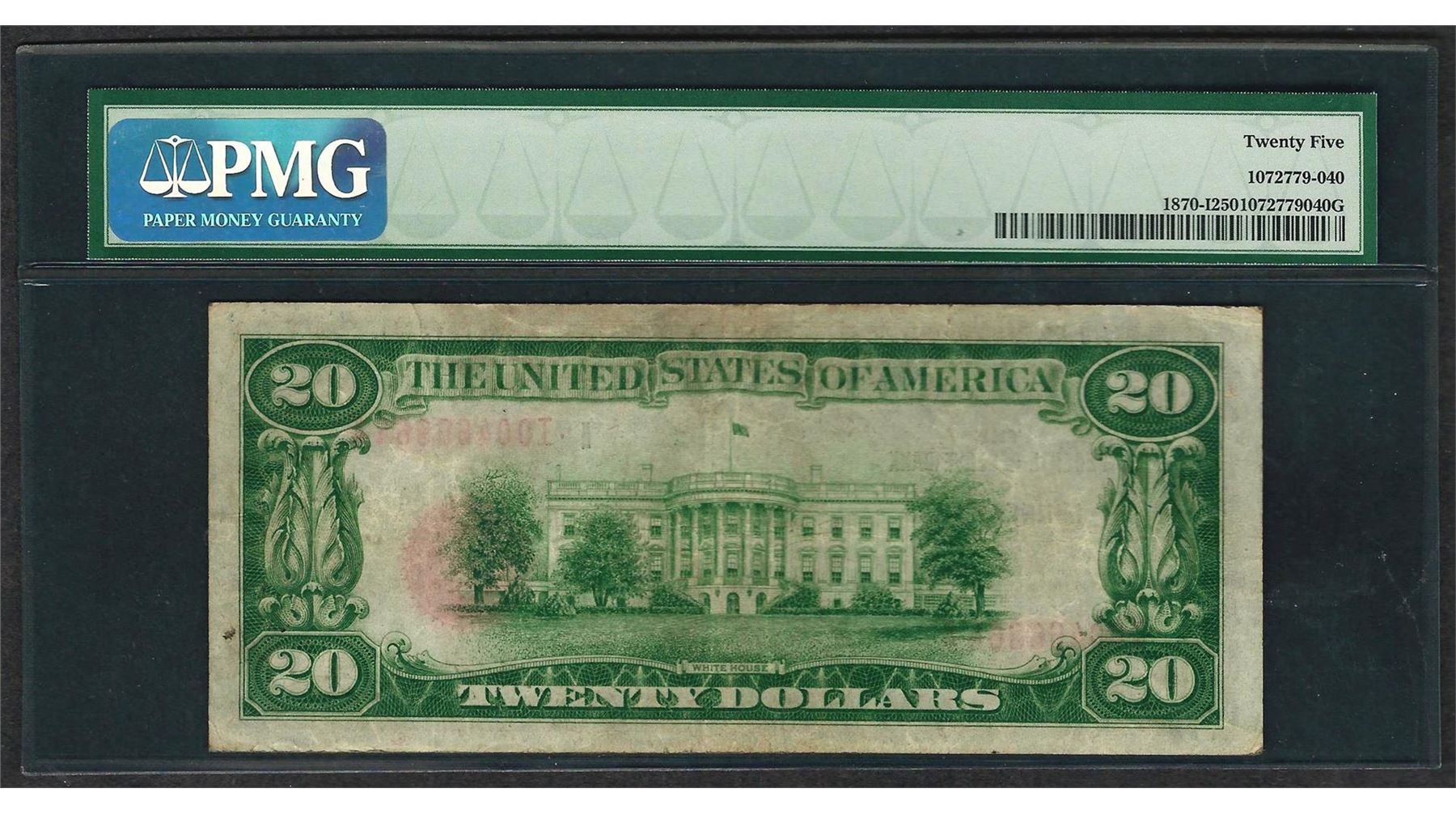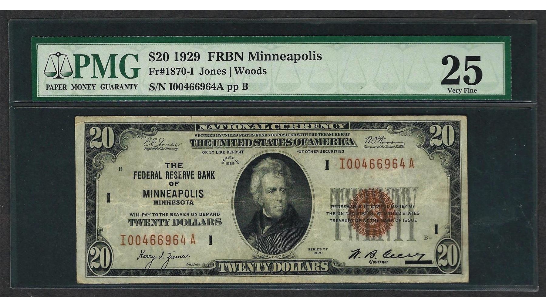 One 1929 $20 Federal Bank of Minneapolis Note Fr.1870-I PMG Very Fine 25. PMG Certified.