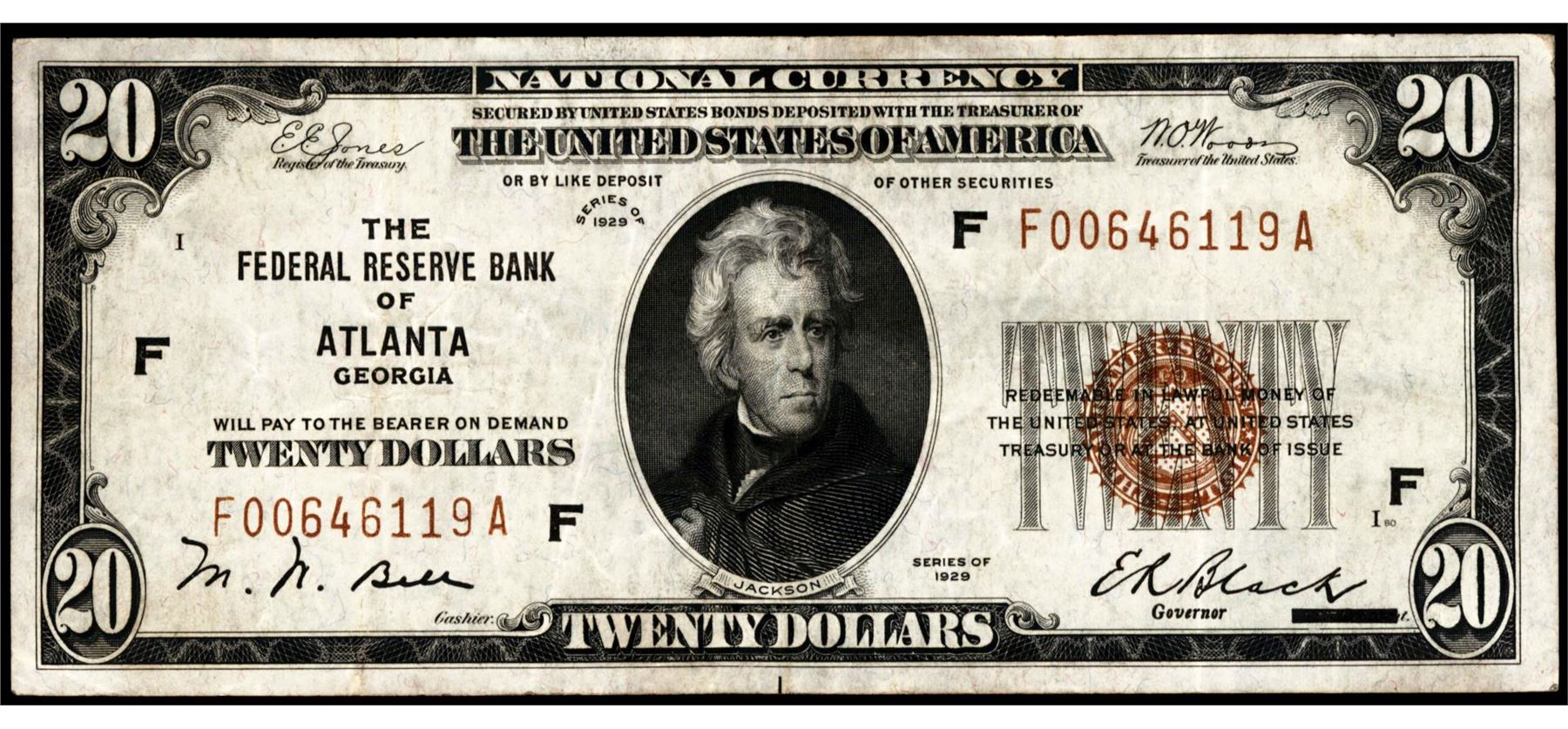 One 1929 $20 Federal Reserve Bank Note Atlanta.