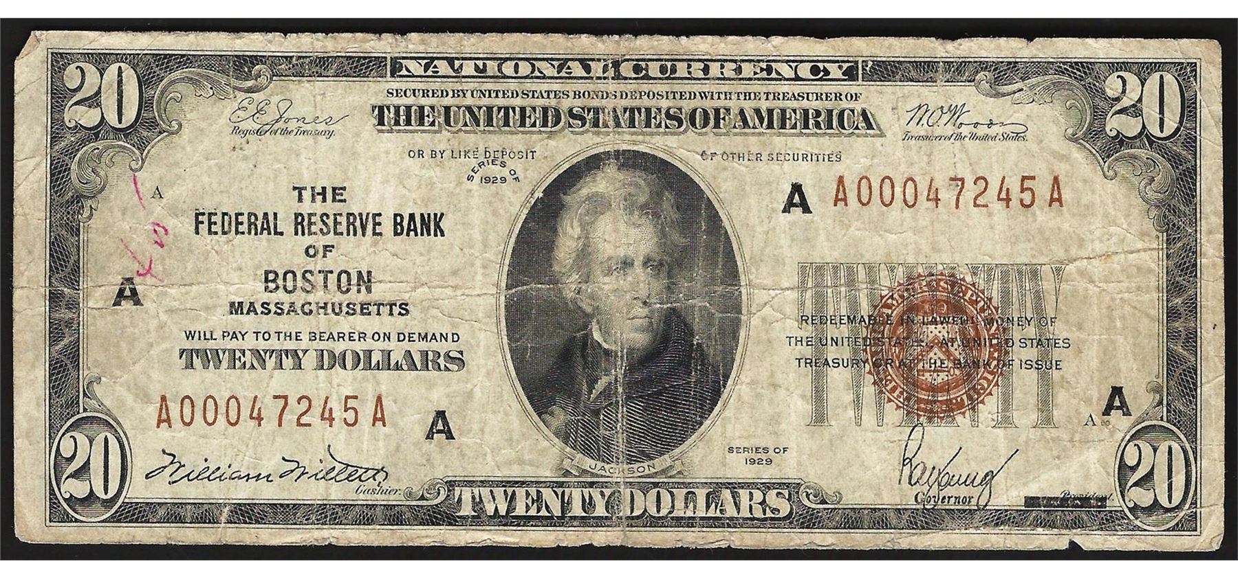 One 1929 $20 Federal Reserve Bank Note Boston.