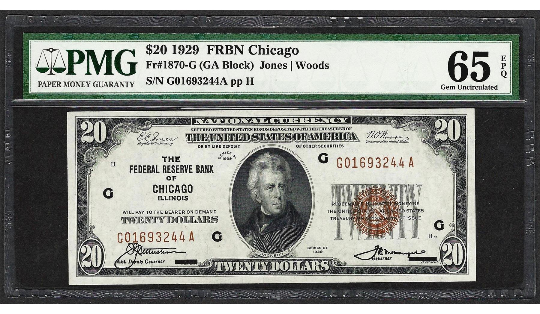 One 1929 $20 Federal Reserve Bank Note Chicago Fr.1870-G PMG Gem Uncirculated 65EPQ. PMG Certified.